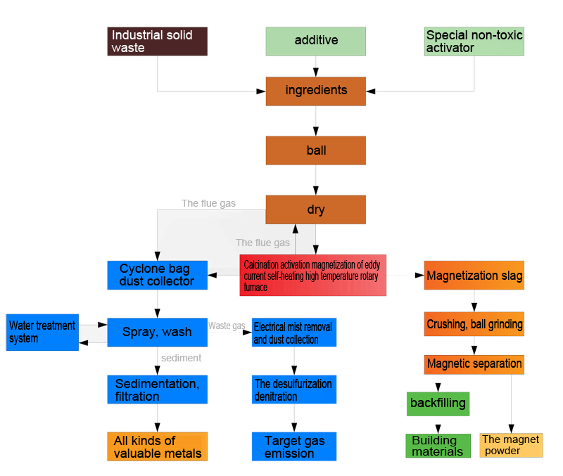 Eddy current self-heating type high temperature rotary furnaces at the top of the bin with the function of prevent vibration and weighing metering, bin exports and imported equipment for the feeder airtight, feeder exports and eddy current self-heating type high temperature rotary furnaces inlet airtight cohesion, feeder according to the set quantity continuously even after molding material into the vortex of autothermal reforming high temperature rotary furnaces calcination and activation, magnetization response. The material in the eddy current self-heating high temperature rotary furnace from front to back through preheating, medium temperature reaction gasification, high temperature reaction gasification, cooling into the slag hopper. Through the screw conveyor and belt conveyor sent to the vibrating feeder, continuous into the mill, the crushed material through the magnetic separator, sorting out the concentrate and tailings. Concentrates are sent to smelting units for resource utilization. The content of metals in the tailings is trace, which is completely incinerated by high temperature organic matter. It is non-toxic and harmless, and can be used as resource utilization of building materials. Complete the material harmless and metal activation, magnetization, separation and resource utilization. The eddy current self-heating high temperature rotary furnace adopts electric heating, which is a clean energy advocated by the state. It produces little waste gas, heating up fast, and temperature control is simpler. The metals in the raw material can be heated up quickly and enter the state of activation and magnetization reaction. The eddy current self - heating high - temperature rotary furnace adopts the counter - current type, more energy saving. The vortex self-heating high temperature rotary furnace is under negative pressure, no dust leakage.