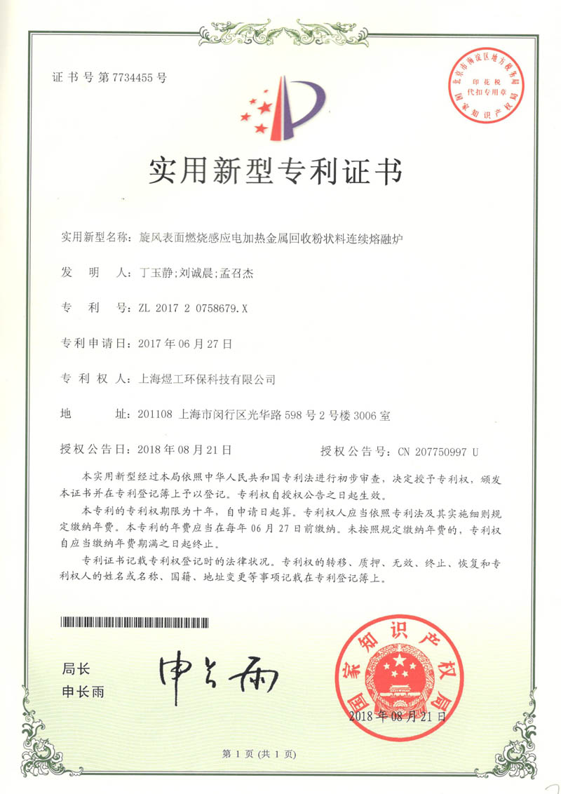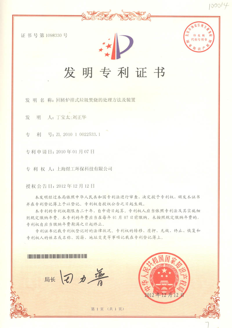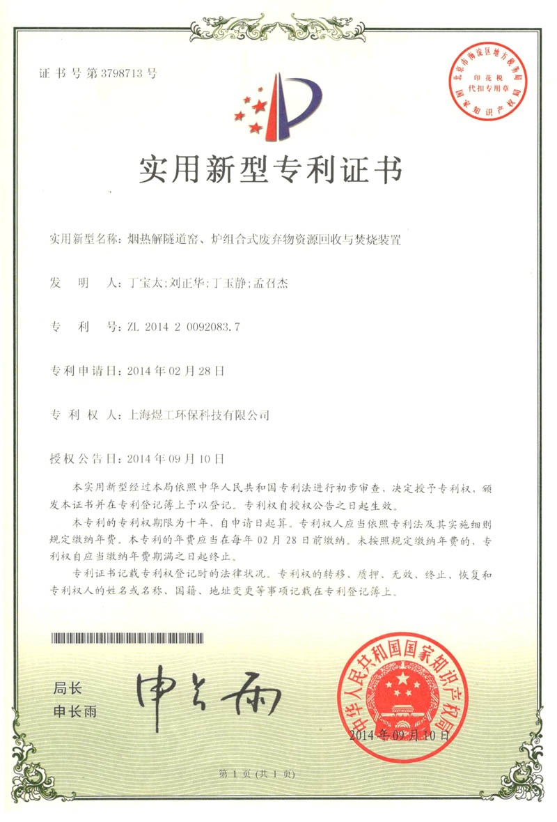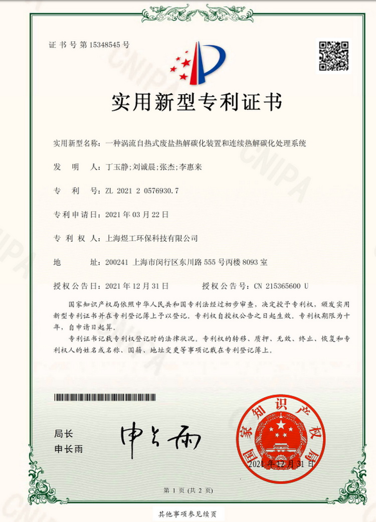 公司與哈爾濱工業(yè)大學(xué)、上海大學(xué)、上海同濟(jì)大學(xué)、上海第二工業(yè)大學(xué)、哈電站集團(tuán)、北方工程設(shè)計(jì)研究院(集團(tuán))有限公司等單位保持長(zhǎng)期緊密的合作關(guān)系,在固危廢焚燒、碳化、脫附、熔融等技術(shù)領(lǐng)域填補(bǔ)國(guó)內(nèi)多項(xiàng)空白,已擁有發(fā)明專利18項(xiàng),實(shí)用新型專利33項(xiàng),注冊(cè)商標(biāo)7項(xiàng)。公司先后獲得上海市高新技術(shù)企業(yè)、上海市專利試點(diǎn)、上海市專精特新、知識(shí)產(chǎn)權(quán)管理體系認(rèn)證等證書。