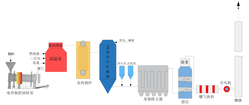 焚燒工段:采用分級供風(fēng)配合電熱脫附回轉(zhuǎn)窯、燃燒器、高溫室、脫銷煙道,將物料中的有機(jī)物最大化的焚毀。